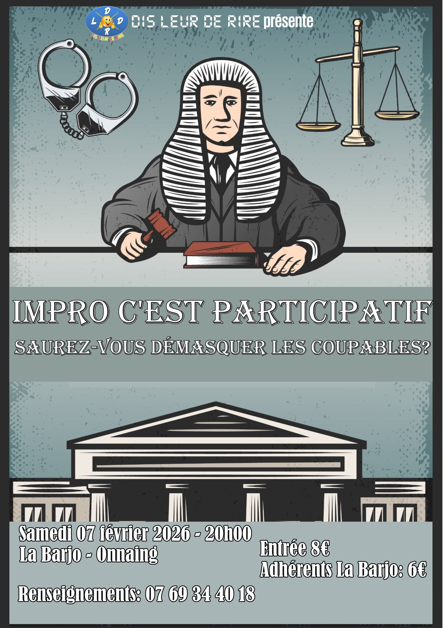 Saurez-vous démasquer les coupables?6 improvisateurs suspects, prêts à tout pour garder leurs secrets et duper le jury. Venez enquêter et démasquer ces malfrats de l'improvisation au cours de 10 enquêtes sous l'égide du juge Amédée Bill.Entrée: 8€ (6€ pour les adhérents à la Barjo)Renseignements: 07...